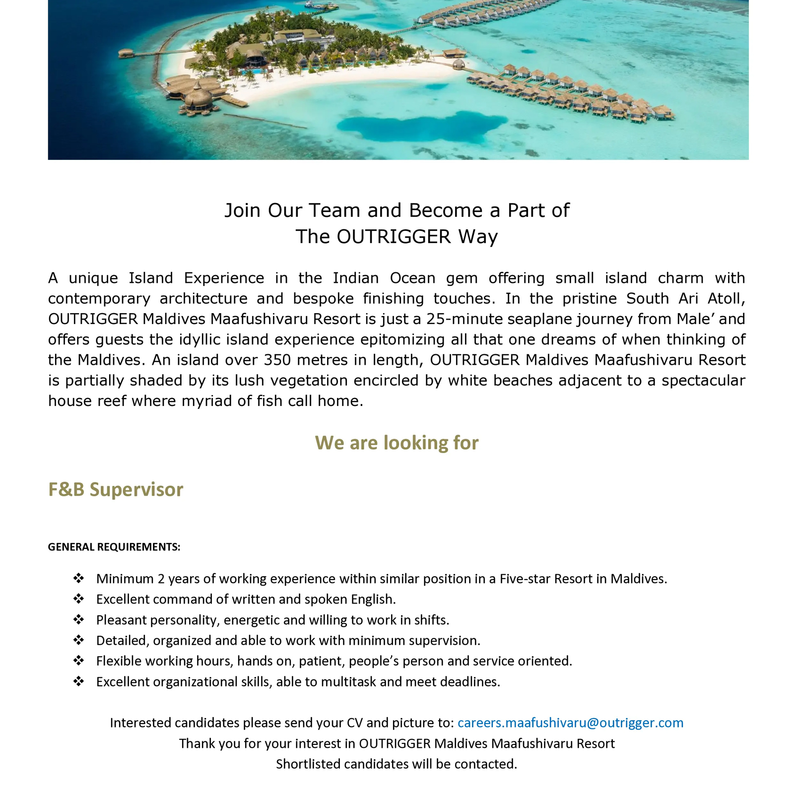 - Experience: Minimum of 2 years in a similar position at a five-star resort in the Maldives.