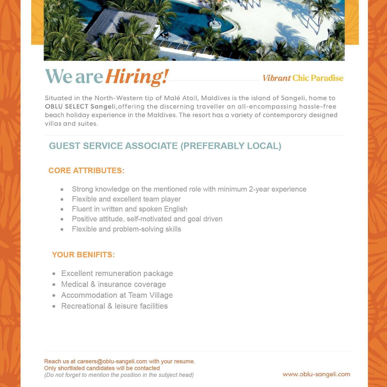 - Mention the position Guest Service Associate in the subject line of your email.