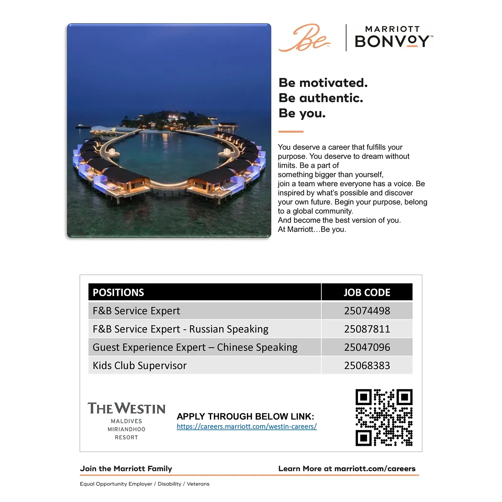 Ready to take the next step in your hospitality career in the Maldives? Apply now and start your journey with Marriott International.